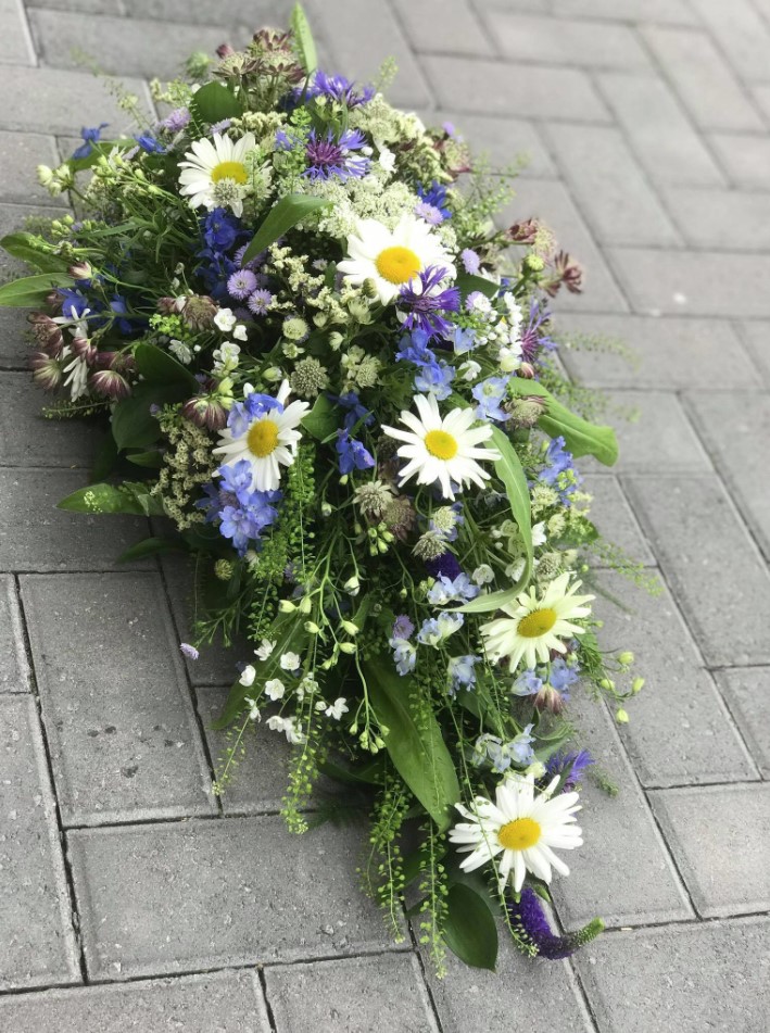 The Single Ended Sprays are created in flower foam in a tray using a variety of flowers and foilage they are rounded at one end and pointed at the other and are very versatile. Available in a range of colours and sizes
